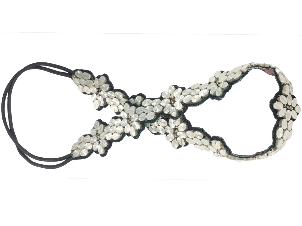 Dieses Haarband ist ein edler und stilvoller Eyecatcher in jedem Haar. Einzelne, fein geschliffene silberfarbenen Metallplättchen bilden ein Blumenmuster, das maximal bis zu etwa 2,5 cm breit wird. Alles ist handgefertigt! Im Nackenbereich wird das Band mit zwei Gummibändern festgehalten und passt sich so jeder Kopfgröße an. Das Haarband eignet sich für jede Haarlänge, egal, ob ihr lange, mittellange oder auch kurze Haare habt.