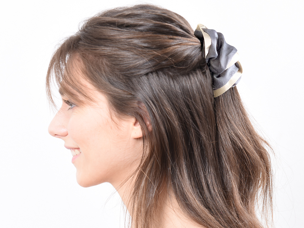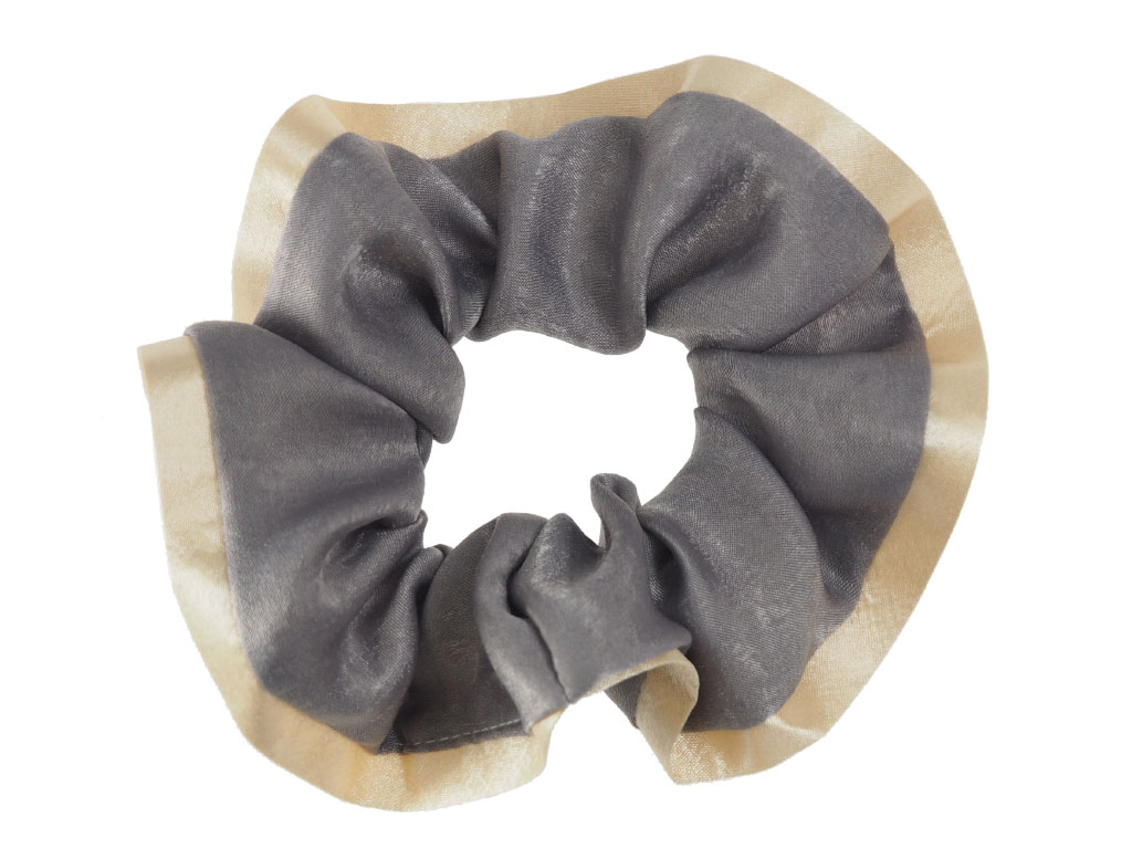 Scrunchie Sakura kommt aus seidig schimmerndem Stoff in einem edlen Grauton daher. Eingefasst ist er mit einer cremefarbenen Paspel, dadurch bekommt der Scrunchie immer eine besonders schöne Form im Haar. Mit Scrunchies kann man herrliche Frisuren zaubern: Egal, ob Pfedeschwanz, Bun, Dutt oder Half-up – mit Haargummi Sakura entsteht dabei ein super edler Look. Scrunchies sind besonders angenehm für die Haare, weil sie komplett ohne haarschädignede Quetschen auskommen.Scrunchie Sakura hat eine Stoffbreite von etwa 5 cm und einen Durchmesser von etwa 13 cm. Der