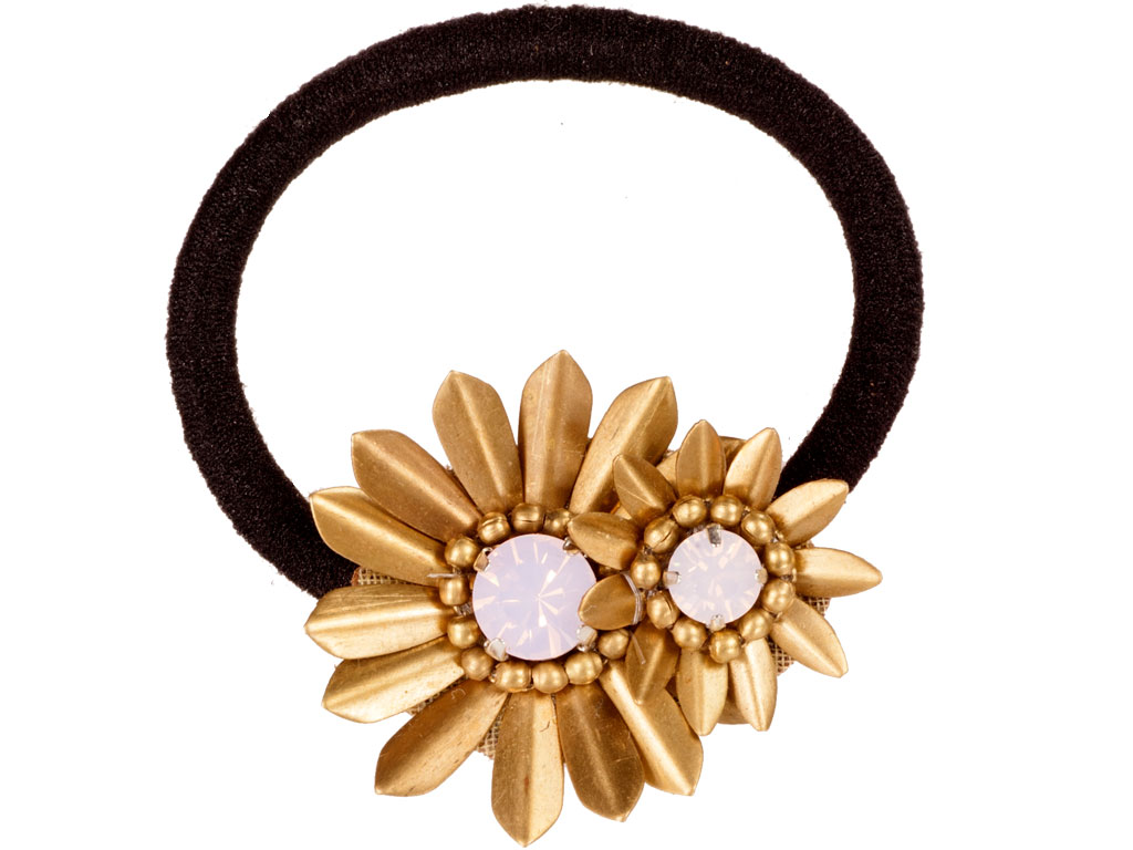 An diesem feinen, handgefertigen Haargummi sind zwei goldfarbene Blumen besfestigt. Als Blütenmitte ist jeweils ein weiß schimmernder Stein eingefasst. Ihr könnt es genauso im Alltag tragen, wie zu besonderen Anlässen und Festen. Man kann mit dem Haargummi nicht nur den allseits beliebten Pferdeschwanz oder einen Zopf festhalten, sondern zum Beispiel auch einen undone Bun oder Dutt.