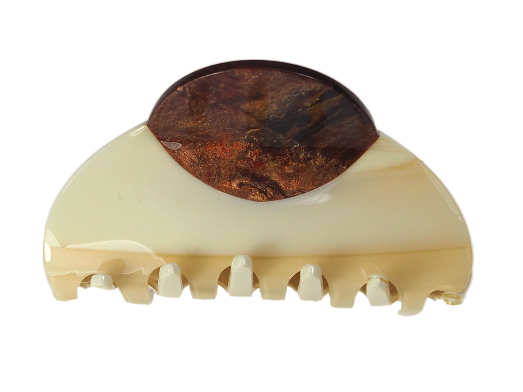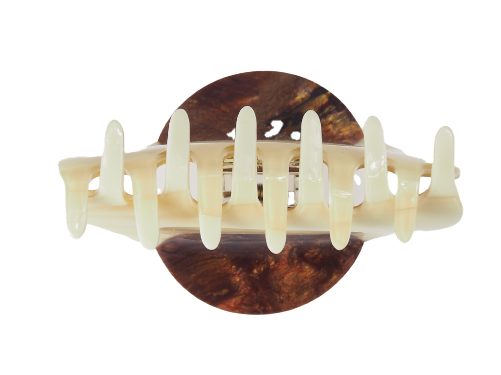 Diese etwa 8 cm lange Haarspange vereint zeitlose Eleganz mit moderner Natürlichkeit. Das sanfte Creme-Beigeharmoniert perfekt mit dem marmorierten Braun des oberen Elements und verleiht deinem Look eine stilvolle Wärme. Durch ihr geschwungenes Design hält sie dein Haar zuverlässig, ohne zu ziepen – ideal für schnelle Alltagsfrisuren ebenso wie für elegante Abend-Looks.