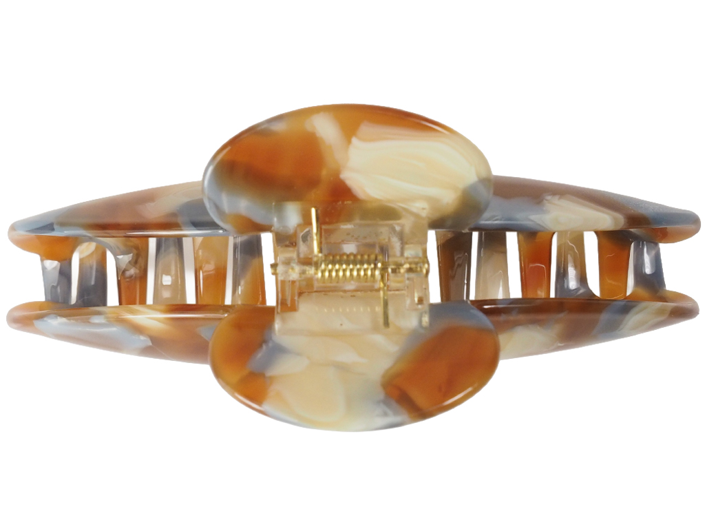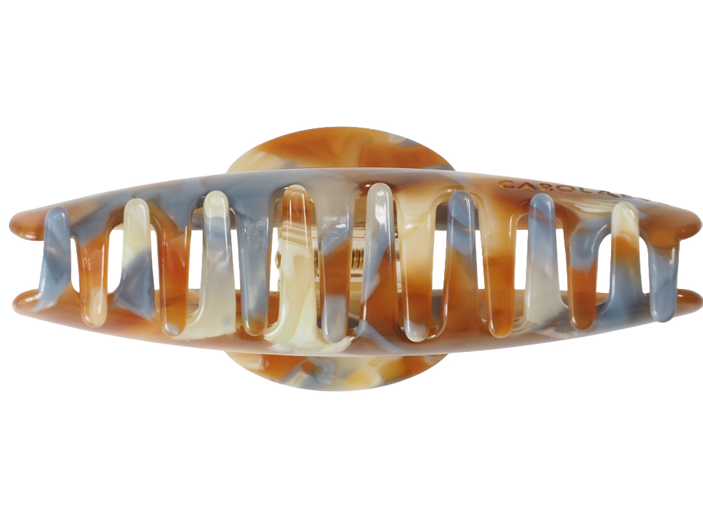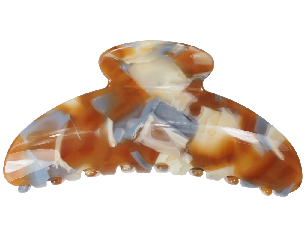 Erlebe mit der Haarklammer Elena Essential eine harmonische Verbindung aus sanften Erdtönen und kühlen Blaunuanzen. Das kunstvolle Design aus hochwertigem Celluloseacetat erinnert an natürliche Gesteinsformationen und macht jedes Stück zu einem kleinen Unikat für dein Haar. Mit einer Länge von etwa 8,5 cm bietet Elena Essential den idealen Halt für verschiedenste Frisuren, ohne dabei schwer zu wirken.
