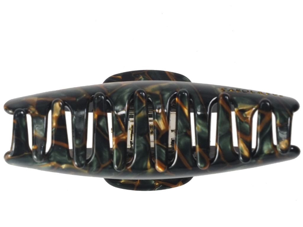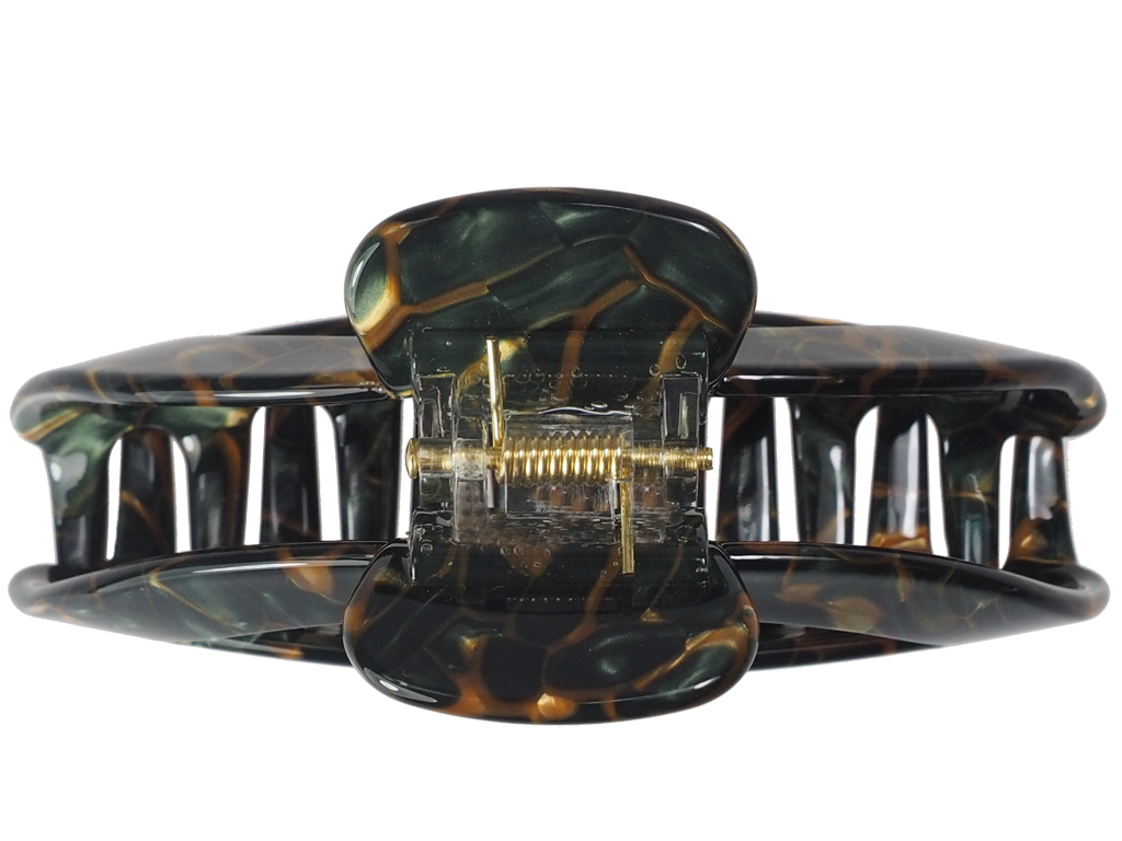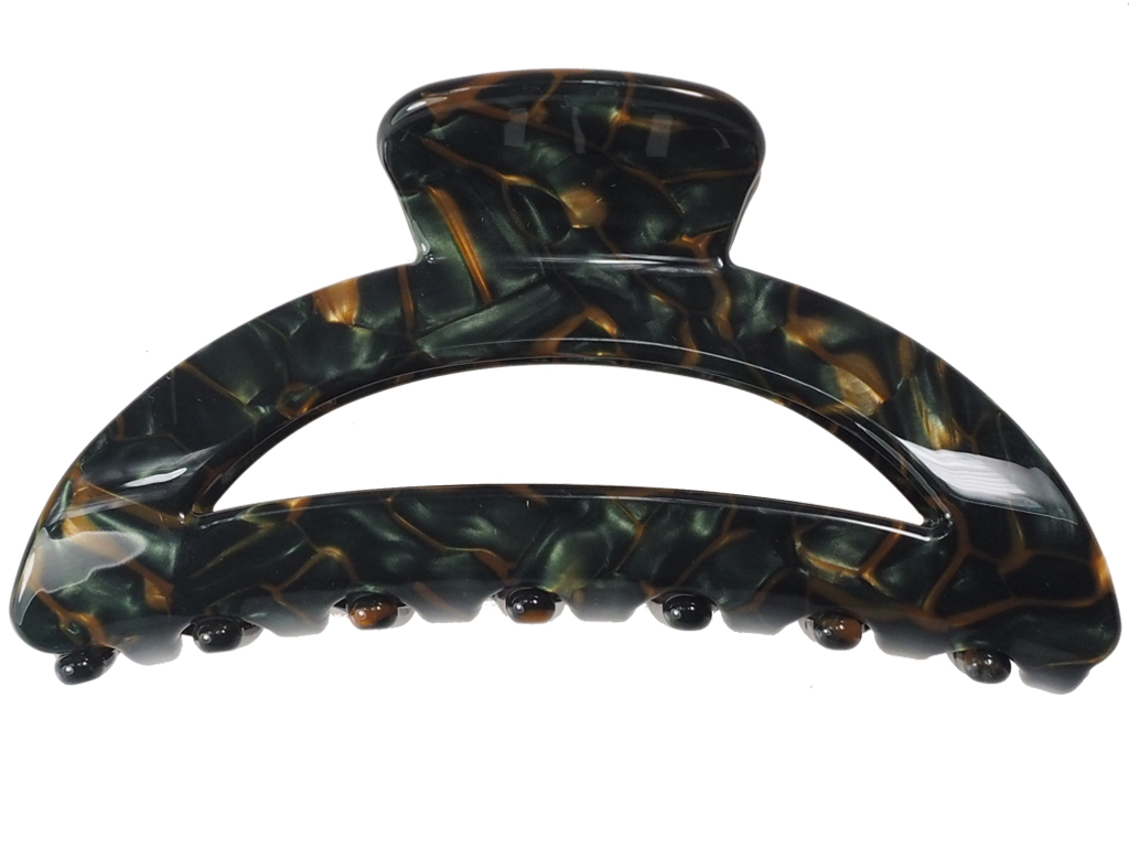 Die Haarklammer Marla Dark ist die perfekte Wahl für dich, wenn du tiefgründige Farben und edle Kontraste liebst. Das dunkle, fast smaragdgrüne Mosaikmuster mit warmen Brauneinschlüssen erinnert an kostbare Edelsteine. Durch die geschwungene Form und die Länge von 8,5 cm bändigt sie dein Haar mühelos und sieht dabei extrem hochwertig aus.