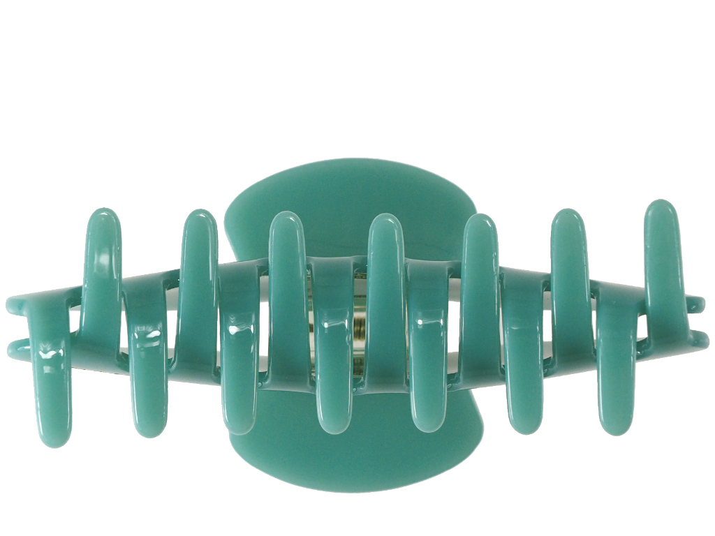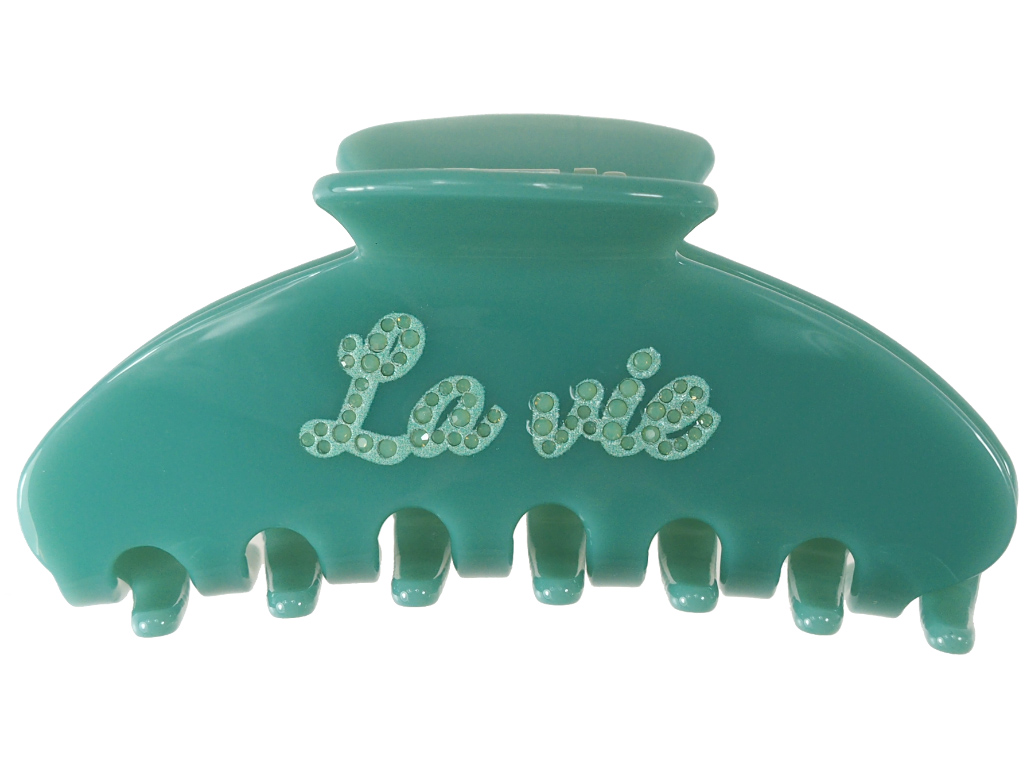 Auf den Fashion Weeks waren ganz besondere Accessoires nicht zu übersehen: Auffällige Haarklammern mit Glitzersteinen! Genau wie diese Haarklammer "La vie" in angesagtem Meergrün mit schönem Glitzerschriftzug "La vie". Die Haarklammer ist ein perfekter und praktischer Begleiter für jeden Anlass. Haarklammer La vie ist ein echter Hingucker. Mit der etwa 10 cm langen Haarklammer könnt ihr im Handumdrehen geniale Frisuren zaubern. Egal, ob ihr euer ganzes Haar hochstecken wollt oder nur Teile davon. Die Haarklammer eignet sich bestens für langes und auch mittellanges Haar. Wir selbst sind total begeistert von dieser wunderschönen Haarklammer, tragen sie ständig im Haar und setzen damit ein echtes gute-Laune-Statement, eine Hommage ans Leben!