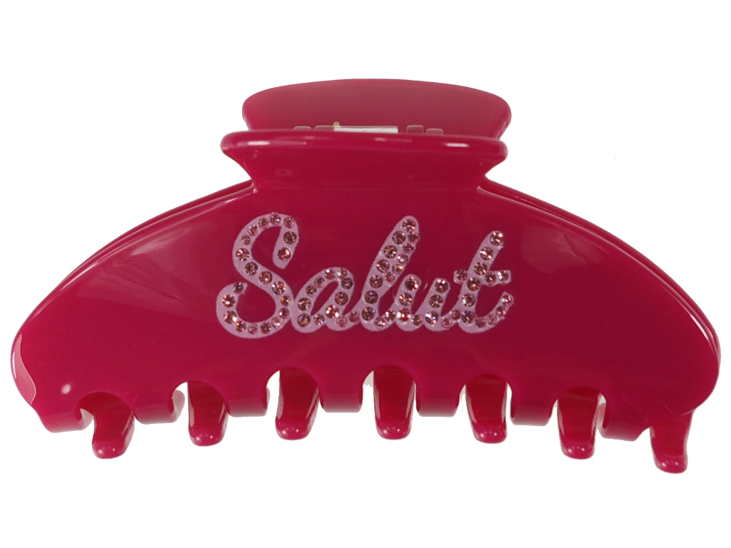 Auf den Fashion Weeks waren ganz besondere Accessoires nicht zu übersehen: Auffällige Haarklammern mit Glitzersteinen! Genau wie diese Haarklammer "Salut" in angesagtem Pink mit schönem Glitzerschriftzug "Salut". Die Haarklammer ist ein perfekter und praktischer Begleiter für jeden Anlass. Haarklammer Salut ist ein echter Hingucker. Mit der etwa 10 cm langen Haarklammer könnt ihr im Handumdrehen geniale Frisuren zaubern. Egal, ob ihr euer ganzes Haar hochstecken wollt oder nur Teile davon. Die Haarklammer eignet sich bestens für langes und auch mittellanges Haar. Wir selbst sind total begeistert von dieser wunderschönen Haarklammer, tragen sie ständig im Haar und setzen damit ein echtes gute-Laune-Statement!