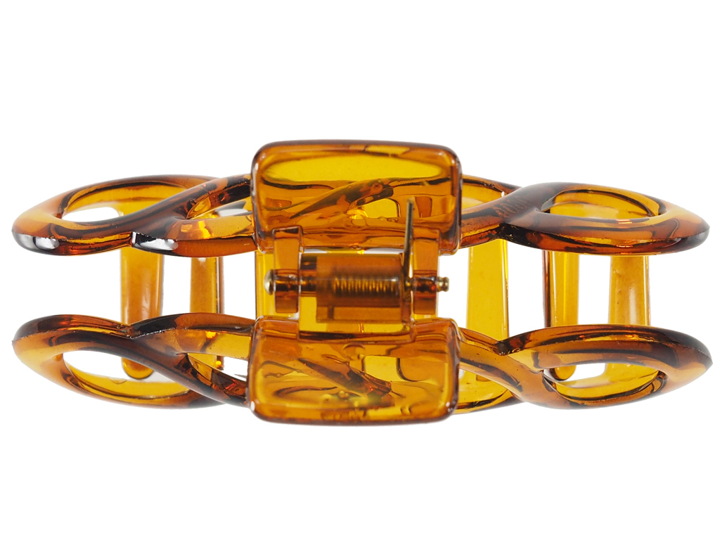 Haarklammer Lou amber mit den ineinander verschlungenen Kreisen ist etwa 8,5 cm lang und eignet sich besonders gut für Half-up-Frisuren. Wegen der runden Aussparungen, sieht diese Haarklammer in jeder Haarfabe super schön aus. Außerdem ist sie angenehm leicht und sitzt auch in feinen Haaren fest. Bei Haarklammer Lou ist die Feder durch eine Abdeckung geschützt, das erhöht den Tragekomfort und sieht optisch hochwertig aus. Haarklammer Lou eignet sich bestens für langes, mittellanges und sogar kurzes Haar, sofern das Deckhaar ausreichend Länge für eine Haarklammer hat.