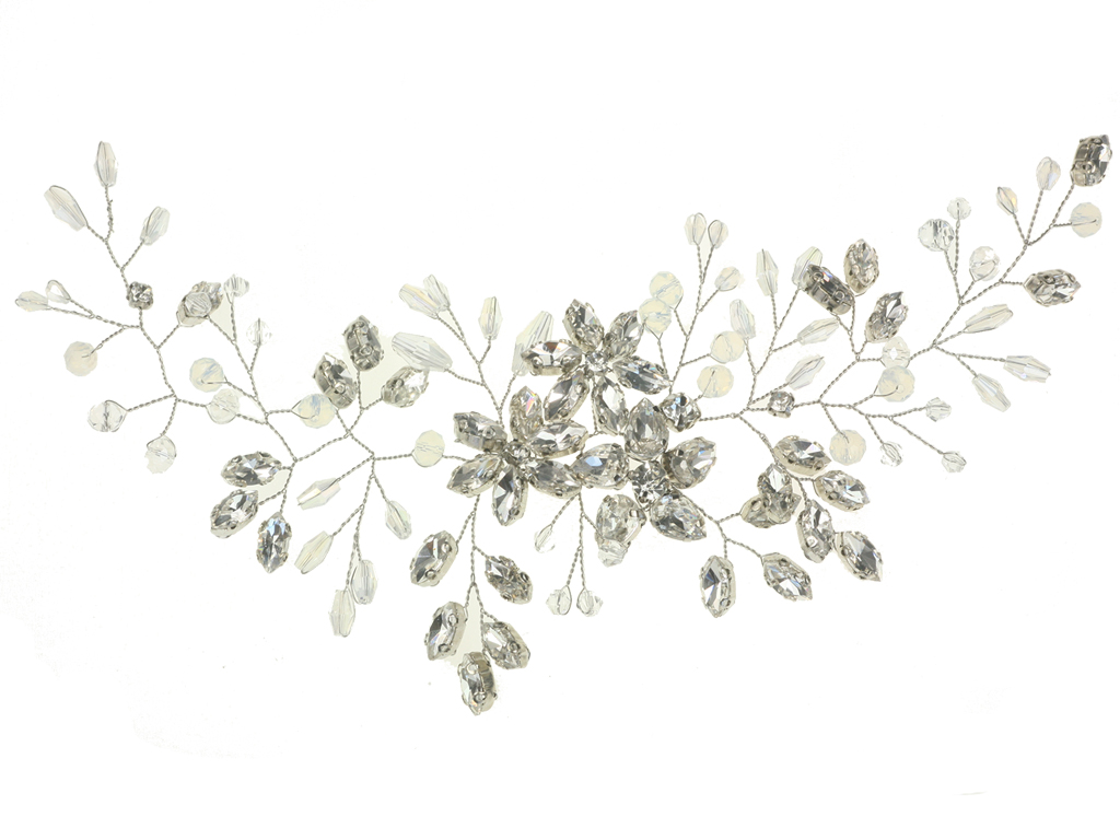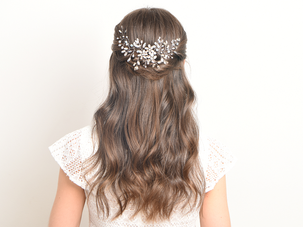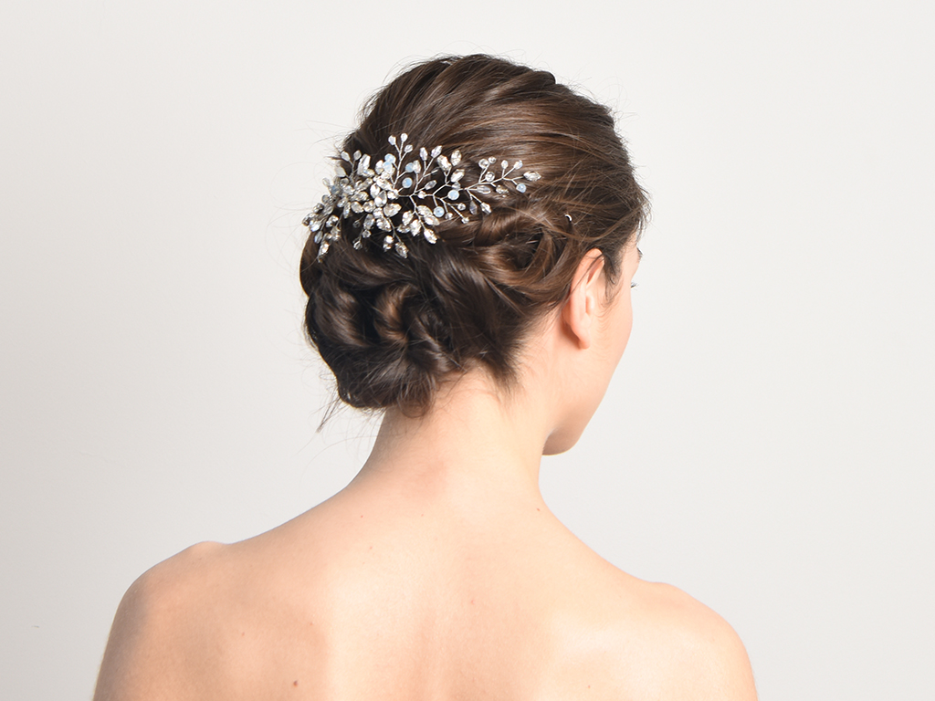 Traumhaft schön ist dieses edle Haargesteck. Es ist etwa 23 cm lang, ungefähr 7 cm breit und läuft auf die Enden hin schmaler zu. Ein zarter, silberfarbener Draht verbindet hier Strass, milchige und transparente, geschliffene Kristallsteine zu einem bezaubernden Braut-Haarschmuck. Das Gesteck wird am Hinterkopf getragen, wahlweise im komplett oder halb hochgesteckten Haar. Das Haargesteck ist ein besonders hochwertiger, edler Hingucker, der jeder Braut einen grandiosen Auftritt garantiert! Es wird auf klassische Art und Weise mit Haarklemmen variabel dort festgesteckt, wo es sitzen soll. (Die Haarklemmen werden nicht mitgeliefert.) Jeder Friseur eurer Wahl wird diesen wunderschönen Brauthaarschmuck problemlos in eurer Wunschfrisur befestigen können.