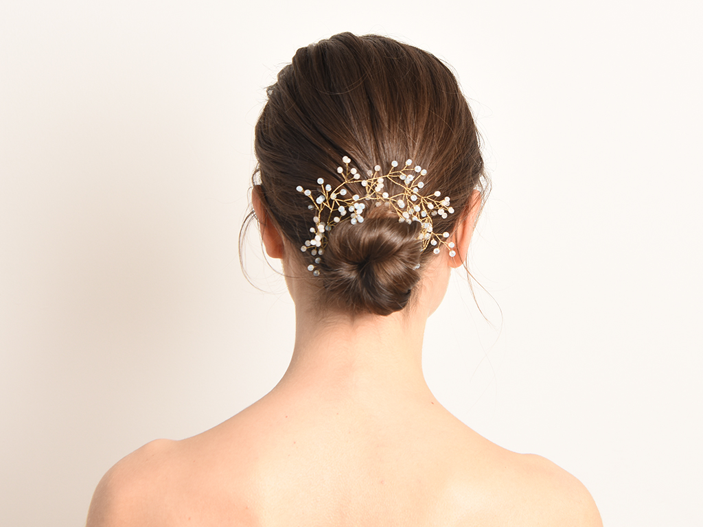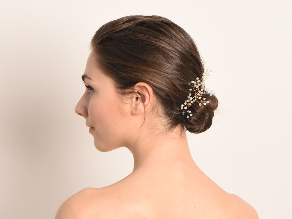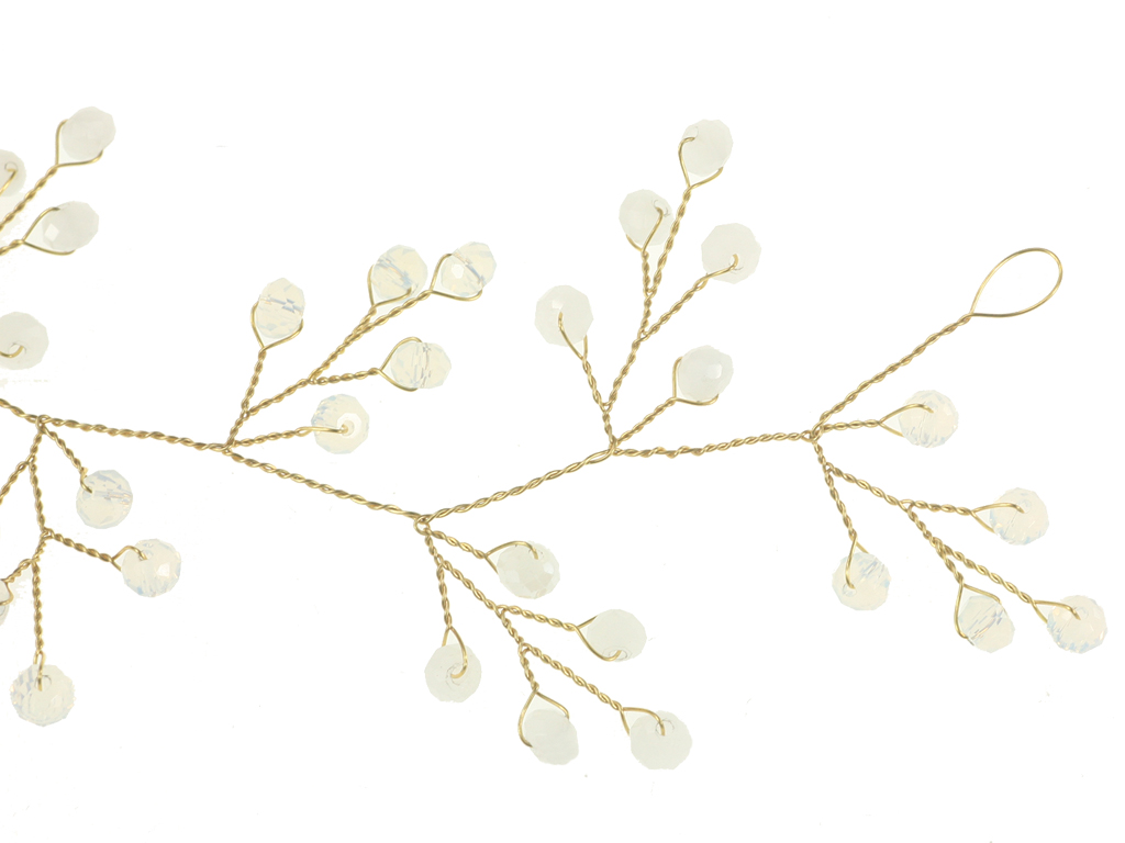 Ein Traum für jede Braut ist dieses zarte Haargesteck! Mit einer Länge von etwa 50 cm und einer Breite von zirka 6 cm bildet ein zarter goldfarbener Draht diesen traumhaft schönen Haarschmuck. Die vielen Verzweigungen enden mit milchig, weißen Kristallperlen. Man kann dieses Braut-Haaraccessoire um den gesamten Kopf gesteckt wahlweise vorne oder hinten offen tragen. Es sieht aber auch wunderschön um einen Chignon gesteckt aus. Dieser Brauthaarschmuck wird auf klassische Art und Weise mit Haarklemmen variabel dort festgesteckt, wo es sitzen soll. (Die Haarklemmen werden nicht mitgeliefert.) Jeder Friseur eurer Wahl wird dieses wunderschöne Haaraccessoire problemlos in eurer Wunschfrisur befestigen können. Und es passt in jedem Fall zu jeder Haarfarbe und auch Länge, egal, ob ihr es im langen, mittellangen oder auch kurzen Haar tragen wollt. Eines ist gewiss: Mit dem traumhaft zarten Brautschmuck Leandra im Haar werdet ihr die perfekte Hochzeits-Frisur tragen!