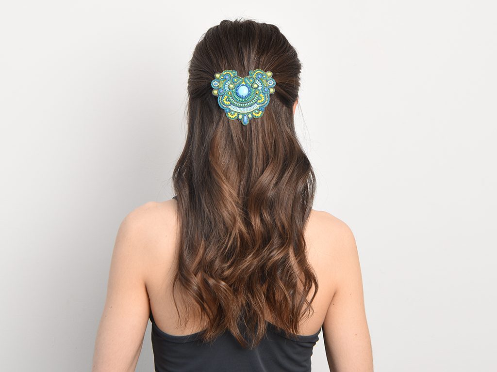 Diese Haarspange ist ein echter Hingucker – das liegt ganz klar am coolen Farb-, Material- und Mustermix. Hier kommen leuchtende Perlen mit verschieden großen Glitzersteinen zusammen. Das Ergebnis ist eine Haarspange der Extraklasse im edel-lässigen Ethno-Style. Die Haarspange ist etwa 8 cm lang. Das Ethno-Motiv misst eine Breite von zirka 10 und eine Höhe von ungefähr 7 cm.