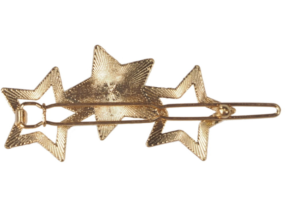 Haarspange Estelle ist eine klassische Seitenhaarspange und sorgt in jeder Frisur für edlen, französichen Chic! Die Haarspange hat eine Länge von etwa 5 cm und besteht aus 3 aneinandergereihten Sternen. Der mittlere Stern ist mit aquamarinfarbenem Acetat gefüllt, die beiden äußeren Sterne sind hohl. Die Haarspange ist aus goldfarbenem Metall gearbeitet und sieht sehr hochwertig aus. In den Haaren setzt sie einen wunderschönen Akzent und sieht sowohl seitlich, alsauch am Hinterkopf getragen sehr edel aus.