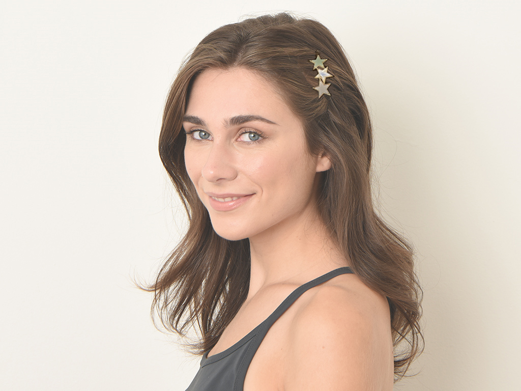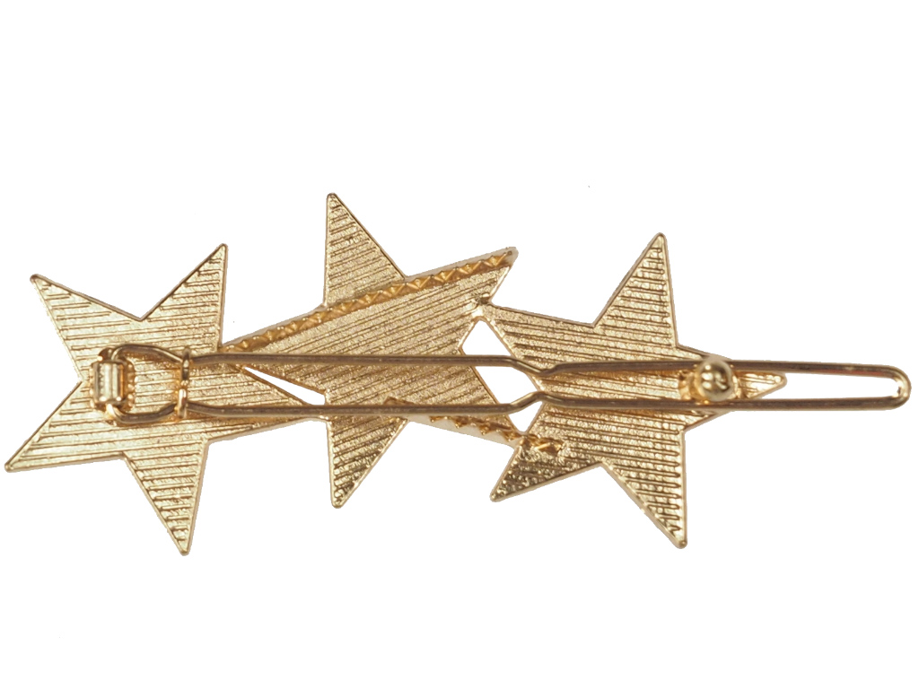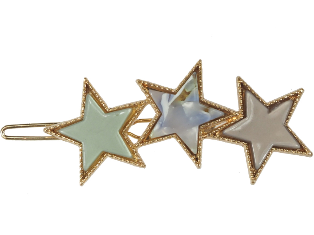 Haarspange Estelle ist eine klassische Seitenhaarspange und sorgt in jeder Frisur für edlen, französichen Chic! Die Haarspange hat eine Länge von etwa 6 cm und besteht aus drei aneinandergereihten Sternen. Die Sterne sind in in schmalem, goldfarbenem Metall eingefasst und mit Acetat gefüllt: Der erste Stern in einem zarten Mintgrün, der zweite in changierendem Grau-Blau und der letzte in in zartem Grau. Die Haarspange ist aus goldfarbenem Metall gearbeitet und sieht sehr hochwertig aus. Unter dem Haarspangenteil befinden sich feinste Zähnchen, die für einen festen Halt der Haarspange sorgen. In den Haaren setzt sie einen wunderschönen Akzent und sieht sowohl seitlich, alsauch am Hinterkopf getragen sehr edel aus.