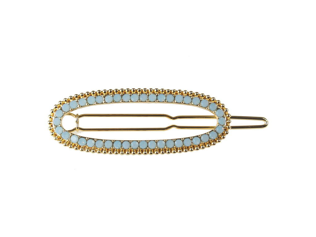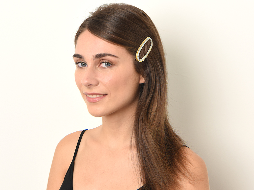 Haarspange Sophie ist eine klassische Seitenhaarspange und sorgt in jeder Frisur für edlen, französichen Chic! Die Haarspange hat eine Länge von etwa 6 cm, eine Breite von ungefähr 2 cm und eine ovale Form. Sophie besteht aus feinen, aneinandergereihte Strasssteinchen, die von einer zarten goldfarbenen Kugelreihe umrahmt wird Die Haarspange ist aus goldfarbenem Metall gearbeitet und sieht sehr hochwertig aus. Unter dem Haarspangenteil befinden sich feinste Zähnchen, die für einen festen Halt in den Haaren sorgen. Haarspange Sophie setzt in jeder Frisur einen wunderschönen Akzent und sieht sowohl seitlich, alsauch am Hinterkopf getragen sehr edel aus.